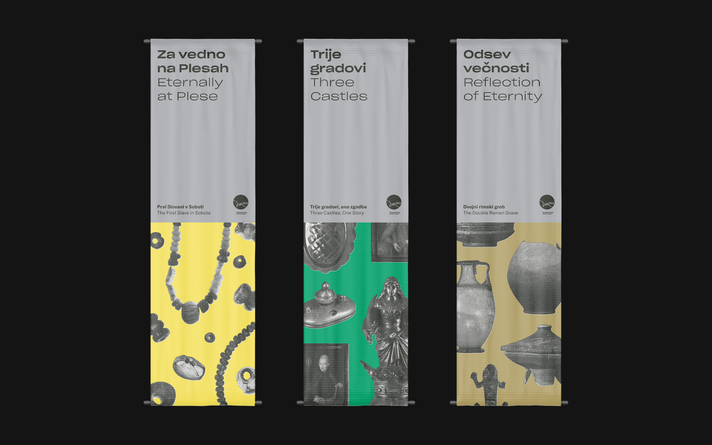 Permanent Exhibition IdentityThe renovation of the permanent exhibition at the Pomurje Museum is divided into a series of smaller topic-based exhibitions. Visual identity connects the graphic imagery of individual exhibitions of different themes into a common entity. Simultaneously, it preserves the differentiation in communication of each one of them.